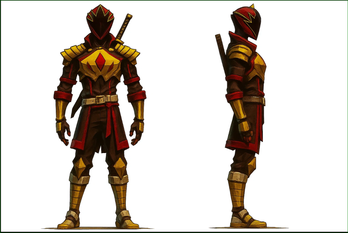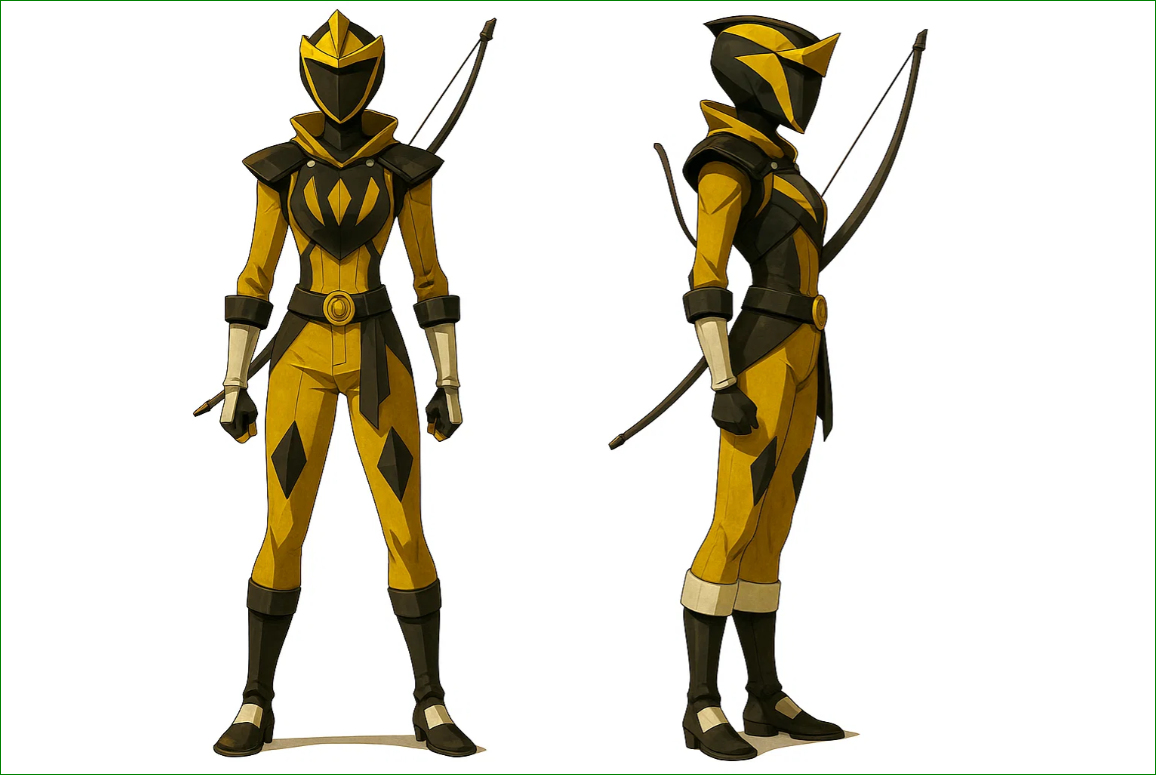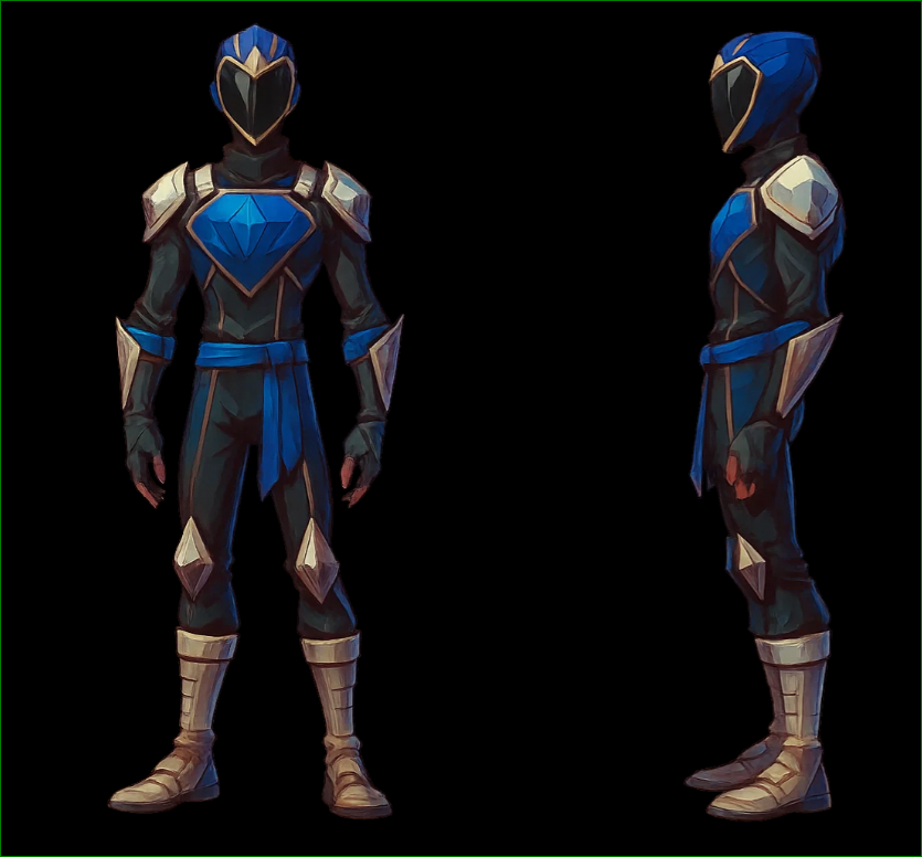 Below are images generated for more final design based of sketches submitted with the prompt," “Can you turn this into a arcane stylized image for a 3d stylized animated power rangers film but not with the traditional power rangers look but the style i created in this image, with no background, Front and side view of an original Power Ranger character design in A-pose, with unique armor style, inspired by the series style of arcane ,into the spiderverse, and the anime to be hero X. Vibrant colors, clear silhouette, line art with clean stylized cel-shading. Designed for 3D character modeling reference sheet A slimmer build of that of someone in their early 20's” The sketches submitted into Sora, were ones I created and I am planning on using these as reference images for 3d modeling and textures the rangers them selves.